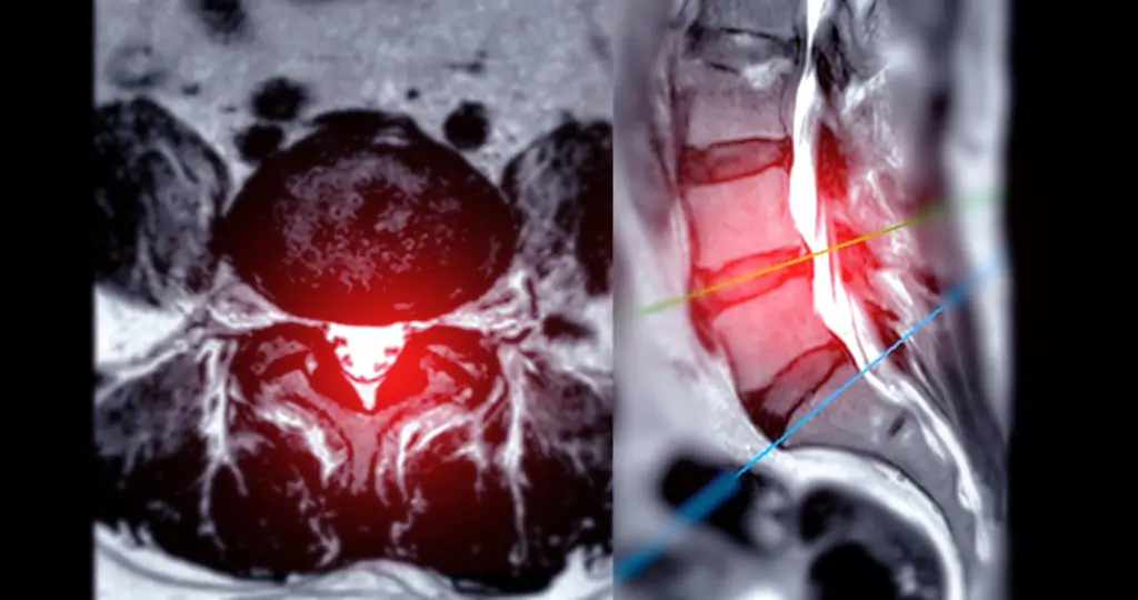 MRI検査 レントゲンでは見つからない微小な圧迫骨折も検出でき、骨折の新旧(急性・陳旧性)の区別も可能です。神経への影響の評価にも有効です。